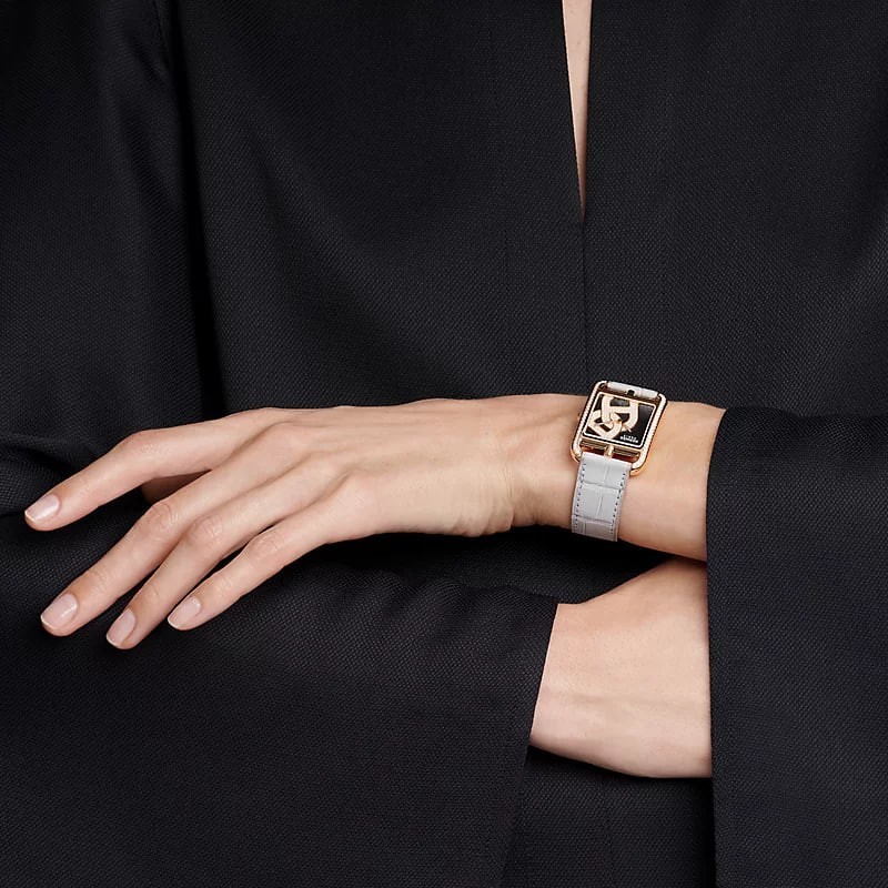 Diamond-set rose gold watch with drop-shaped inlays, quartz movement, diamond-set obsidian dial with "anchor chain" motif set with diamonds, and long interchangeable straps in cream matte alligator leather.