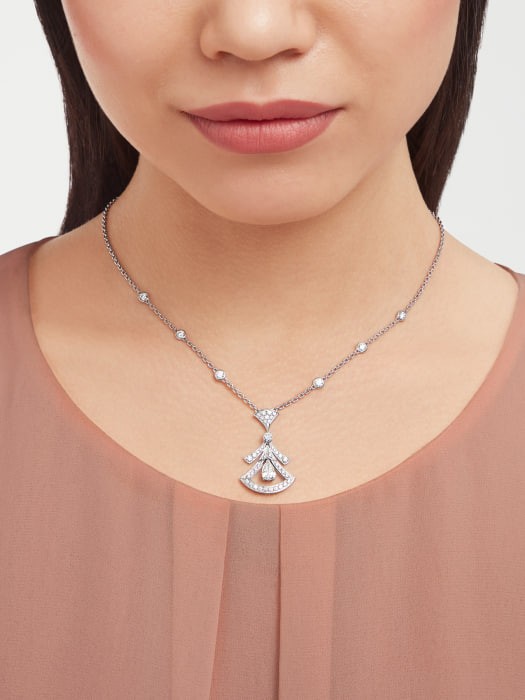 The DIVAS' DREAM necklace captures the essence of Italian aesthetics and elegance, paying homage to the enchanting goddess in the unique Roman spirit. THE GLAMOROUS AND DELICATE JEWELRY IS FAN-SHAPED INSPIRED BY THE MOSAIC DECORATIONS OF ROMAN'S CARACALLA BATHS, AND REINTERPRETED WITH LIGHT OPENWORK ELEMENTS AND BRILLIANT DIAMONDS.