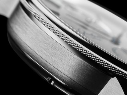 Dial material brass; frosted silver plated, electroplated gray, solid gold with blue coating, inlaid Roman numerals, orbital scale ring, blue printed fonts; blue steel hands