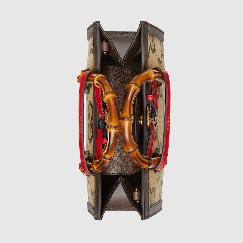 As an iconic symbol of the brand, logo elements continue to bring more new ideas to single products in novel and unique ways. Each logo contains the brand's unique historical heritage and value pursuit, and interprets the fashion aesthetic concept with charm. Each series uses a modern perspective to reinvent the old and bring forth the new, interpreting the brand identity through continuous changes and experiments. This double G pattern presents the classic double G monogram pattern in an exaggerated way that is different from the past, and vividly interprets a variety of ready-to-wear and accessories items in the "Aria-Fashion Aria" series. Gucci Diana small bamboo tote bag with brown leather trim.
