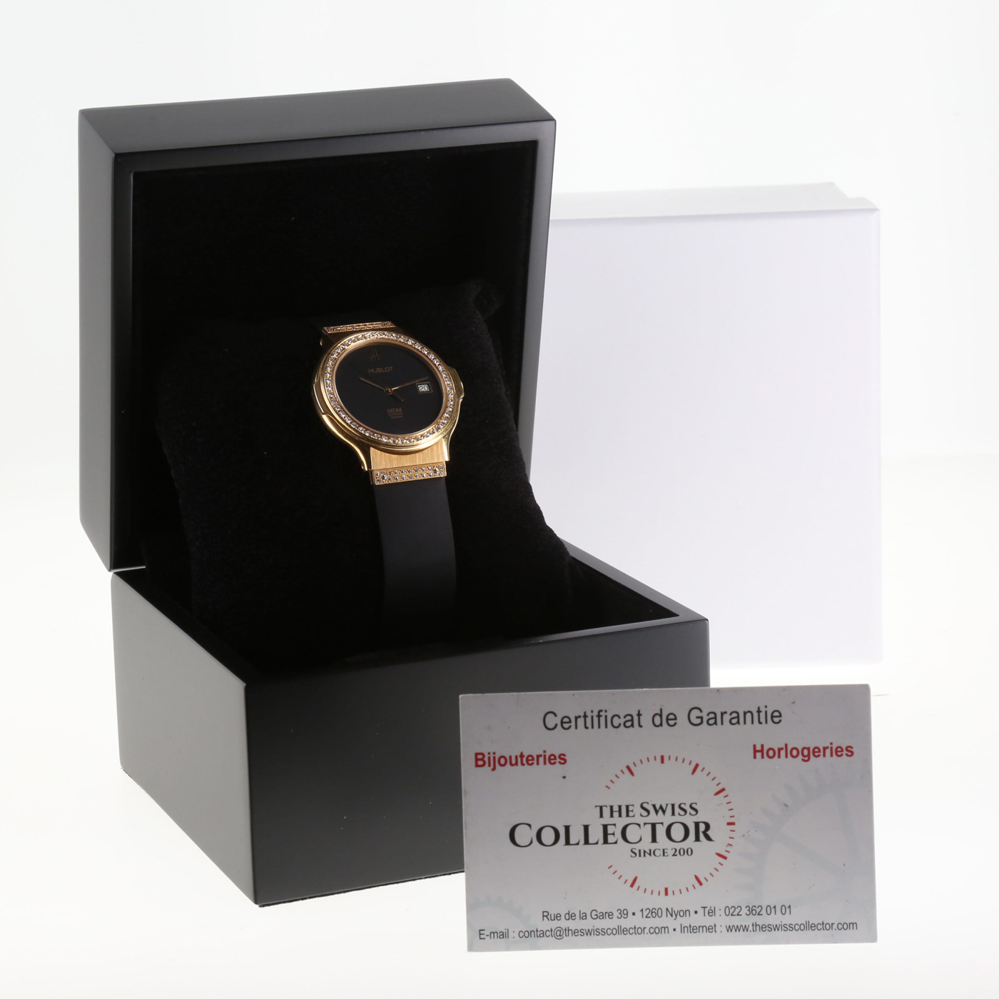 Dây đeo cao su đen với khóa gập đôi bằng vàng vàng 750/18 carat được đính 36 viên kim cương cắt brilliant hiện đại chất lượng hàng đầu của Wesselton, mỗi viên nặng 0,01 carat, tổng trọng lượng 0,036 carat.