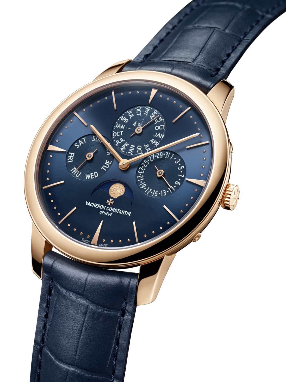 This 18K pink gold watch is equipped with an ultra-thin self-winding movement, its thickness is only 4.05 mm, and it is equipped with an elegant perpetual calendar display, which can operate accurately until the year 2100. The 18K gold moon phase is even more eye-catching on the blue dial, which is made of champlevé enamel against the sky background and decorated with two hand-decorated moons.